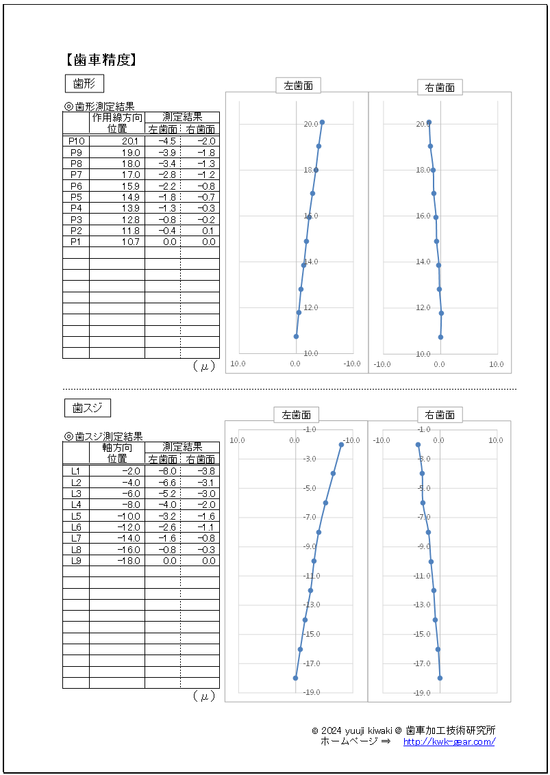 測定結果はGAMのソフトウェアから印刷できる記録用紙に測定値を記入し、その値をGAMのソフトウェアに入力することで、下図のような歯形・歯スジの測定結果のグラフ表示が得られます。