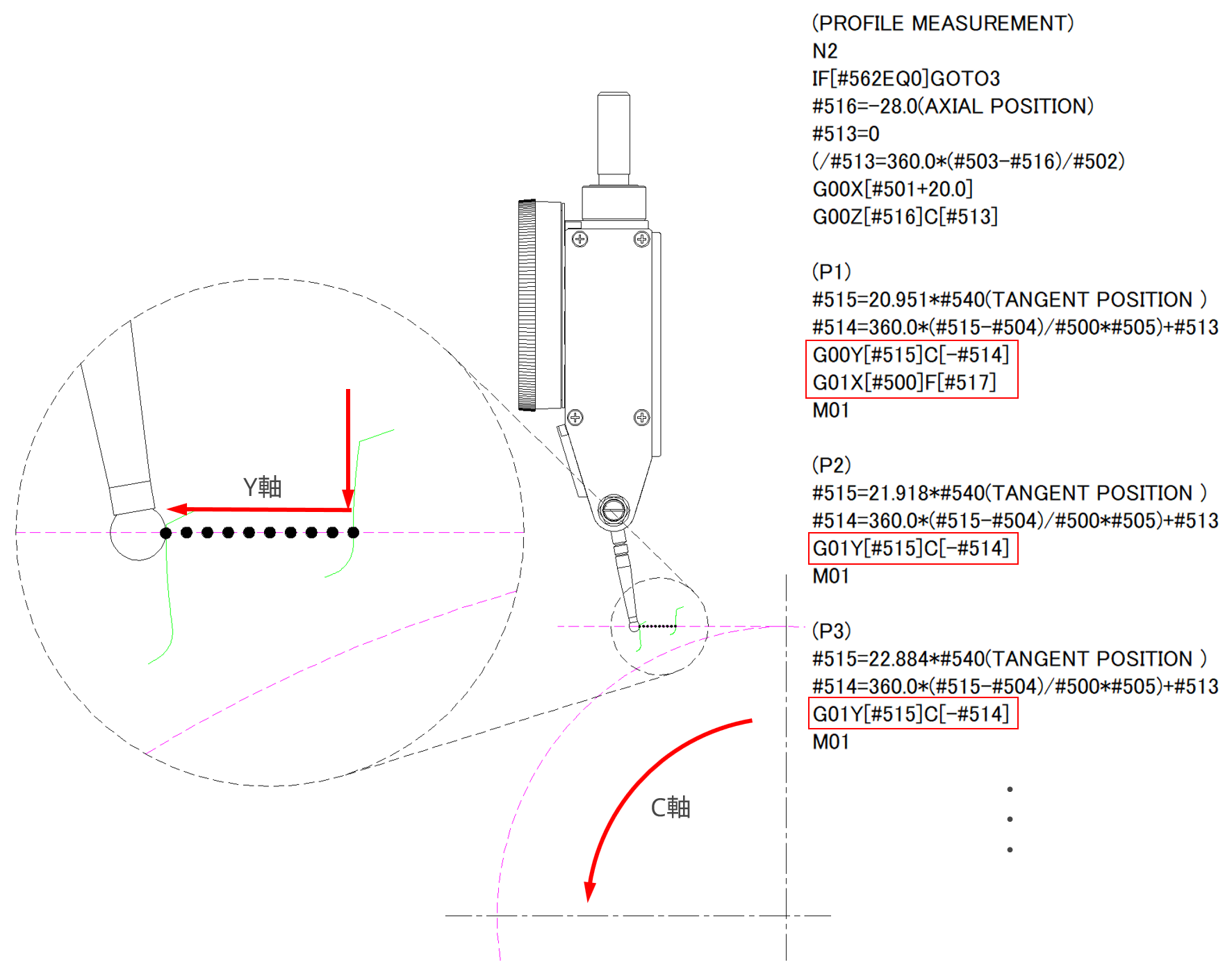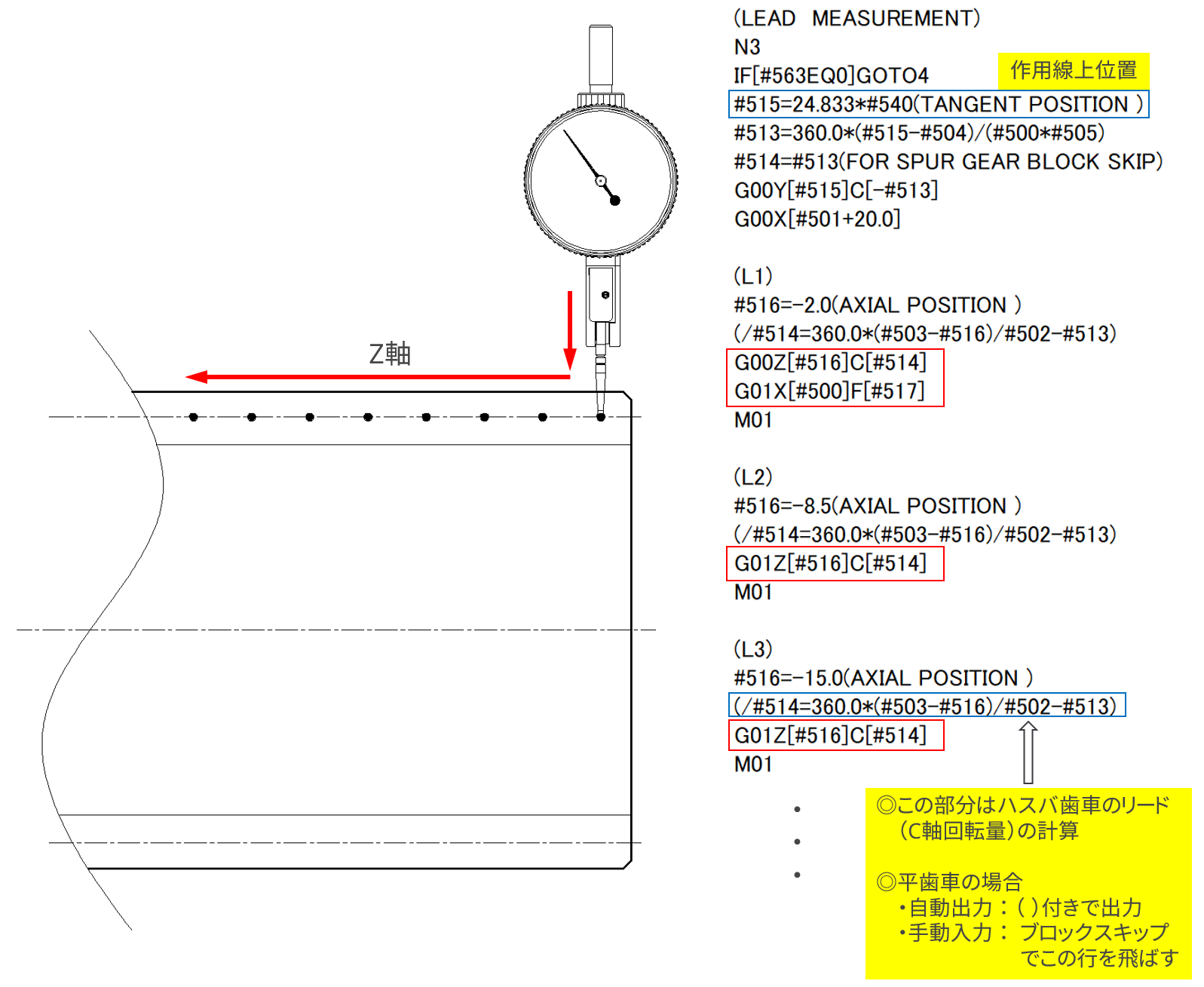 また、GAMはソフトウェアを使用しなくても、GAMで出力されたNCプログラムのマクロ変数の値等を少し編集すれば、様々な平・はすば歯車の諸元に対して測定可能になります。