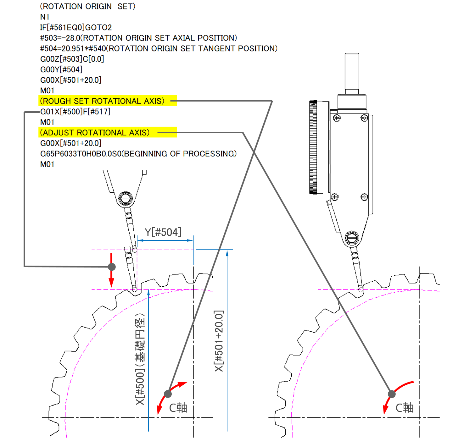 次にGAMのNCプログラムを実行し、下図のように歯面にテストインジケーターを接触させ、C軸(ワーク回転軸)の原点設定を行います。