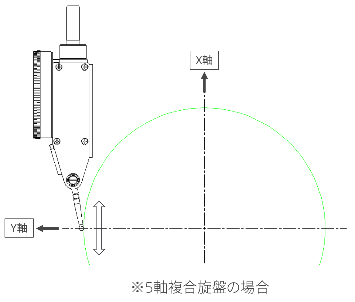 測定前に振れの無いマスターワークや旋削円筒に対して下図のようにテストインジケーターを接触させ、X軸とY軸の原点設定を行います。