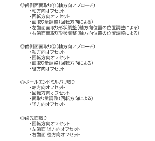 DGCでは、以下の4項目の面取りを行うことができ、これらを組み合わせた裏側端面の歯側面の面取りを含めた1つのNC加工プログラムを出力します。