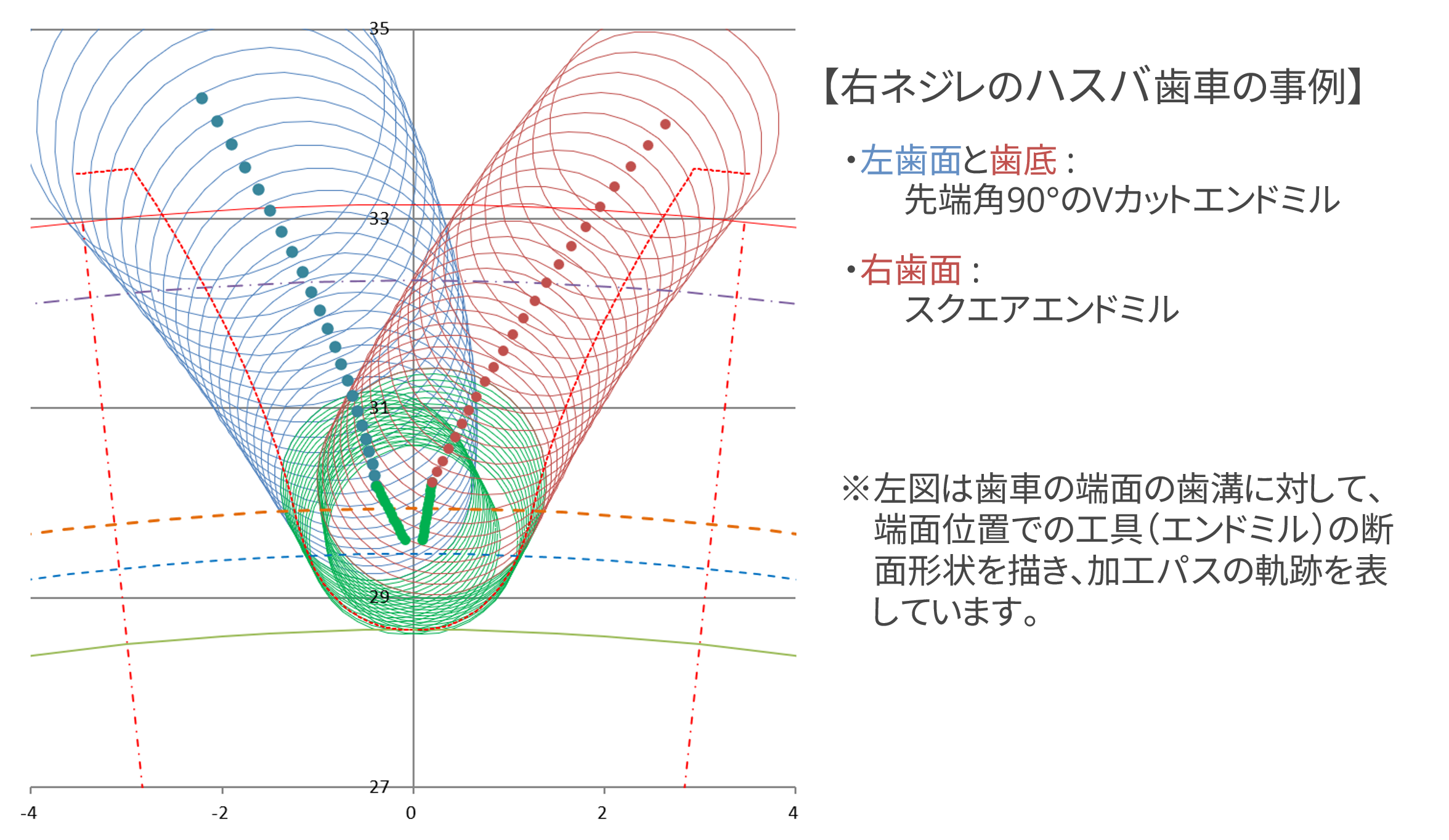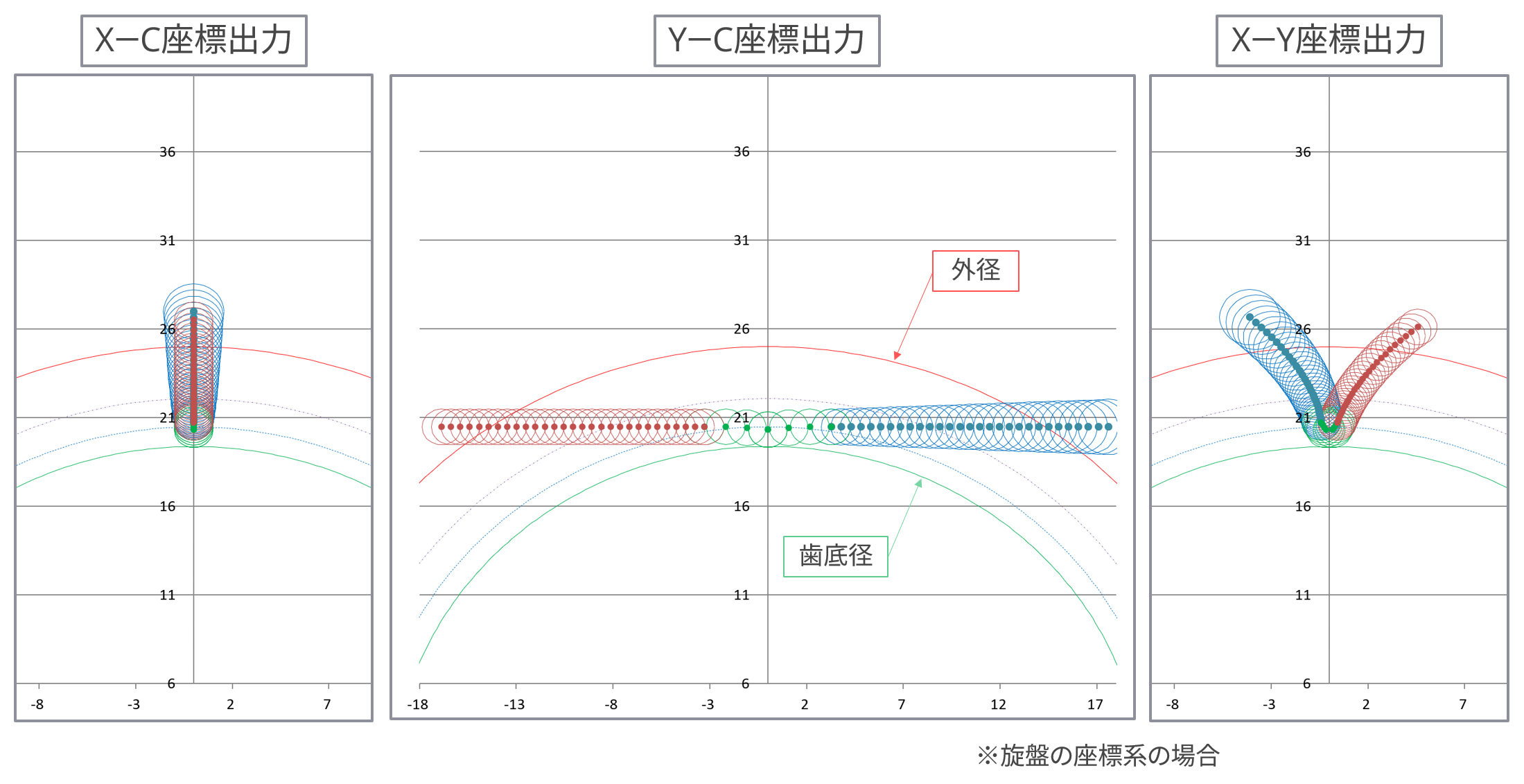 反対側からアプローチする場合は、先の軸方向の任意断面の図で工具と歯面の干渉を確認し、実際の加工時も注意して設備を操作する必要があります。ただし、工具の動かし方の入力はこちらの方が分かりやすいです。(ここでは詳細の説明は省略します。)