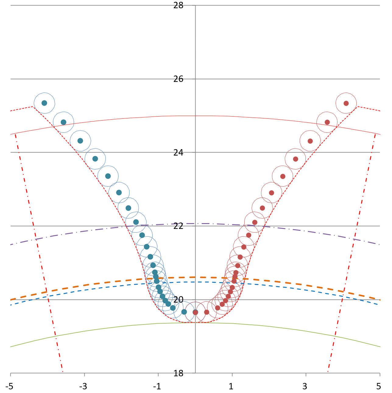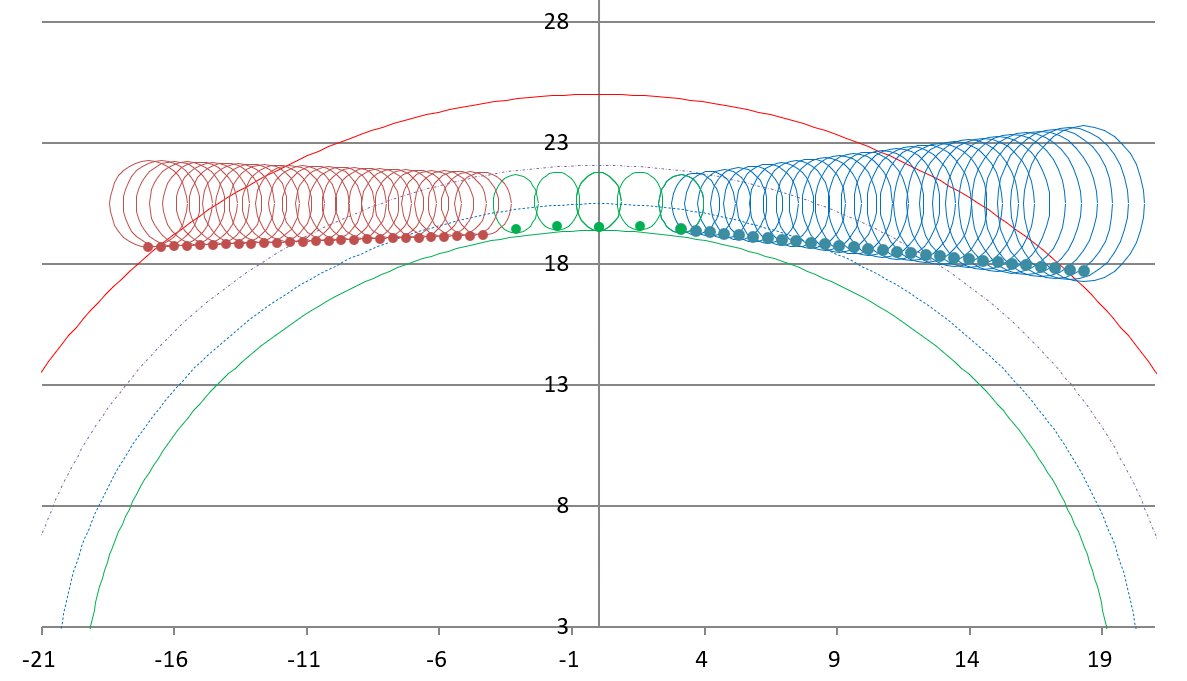 下の図は、歯車端面での、ほんの僅かに切り込んだボールエンドミルの断面の加工パスの軌跡を描いたものです。このように忠実に歯車の歯形形状に沿ってボールエンドミルを動かすことでバリ取りを行います。