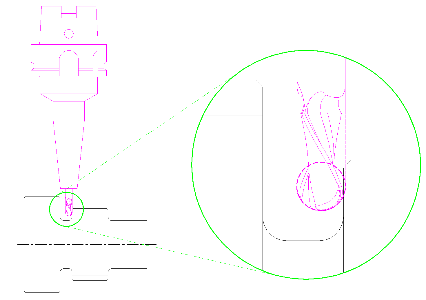 軸方向からのアプローチする場合でも、下図のように少し工具を傾けて干渉を避けて加工することが出来ます。