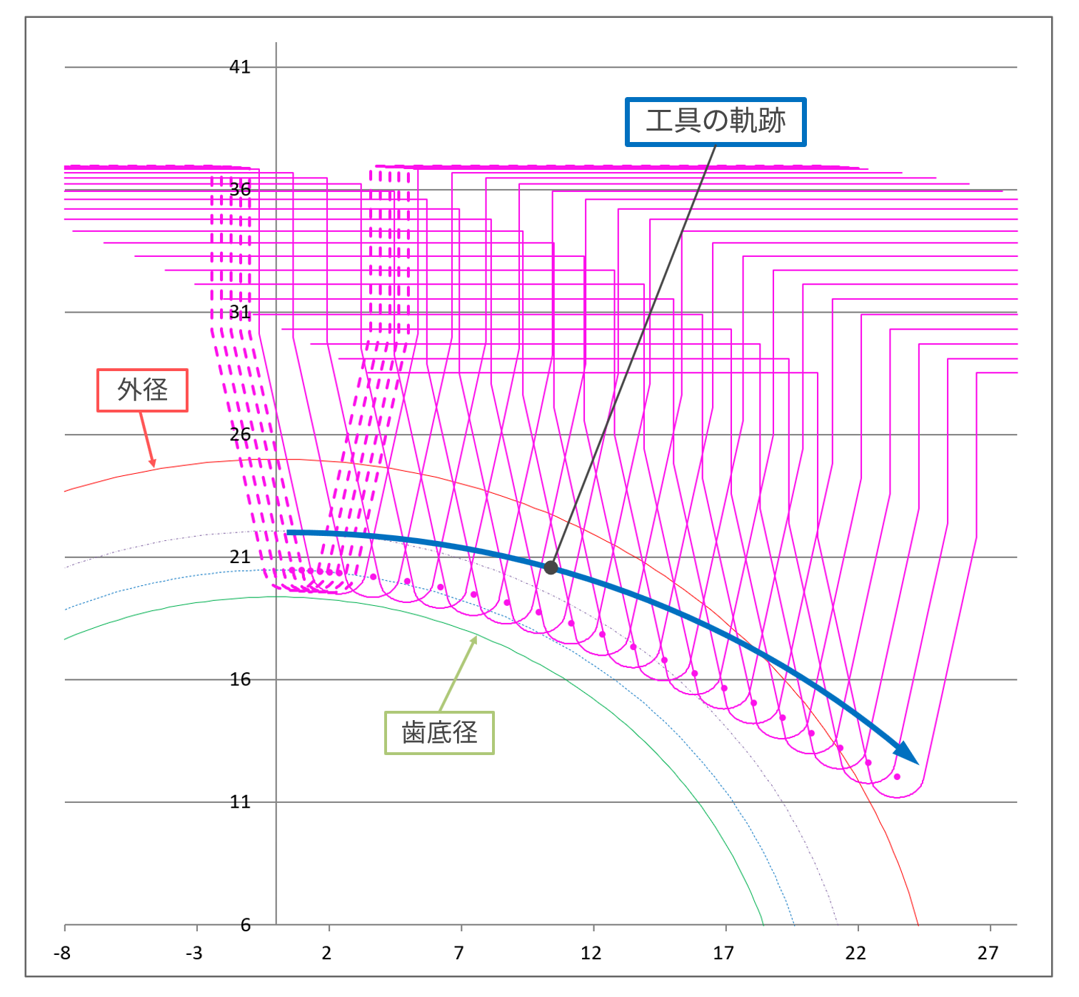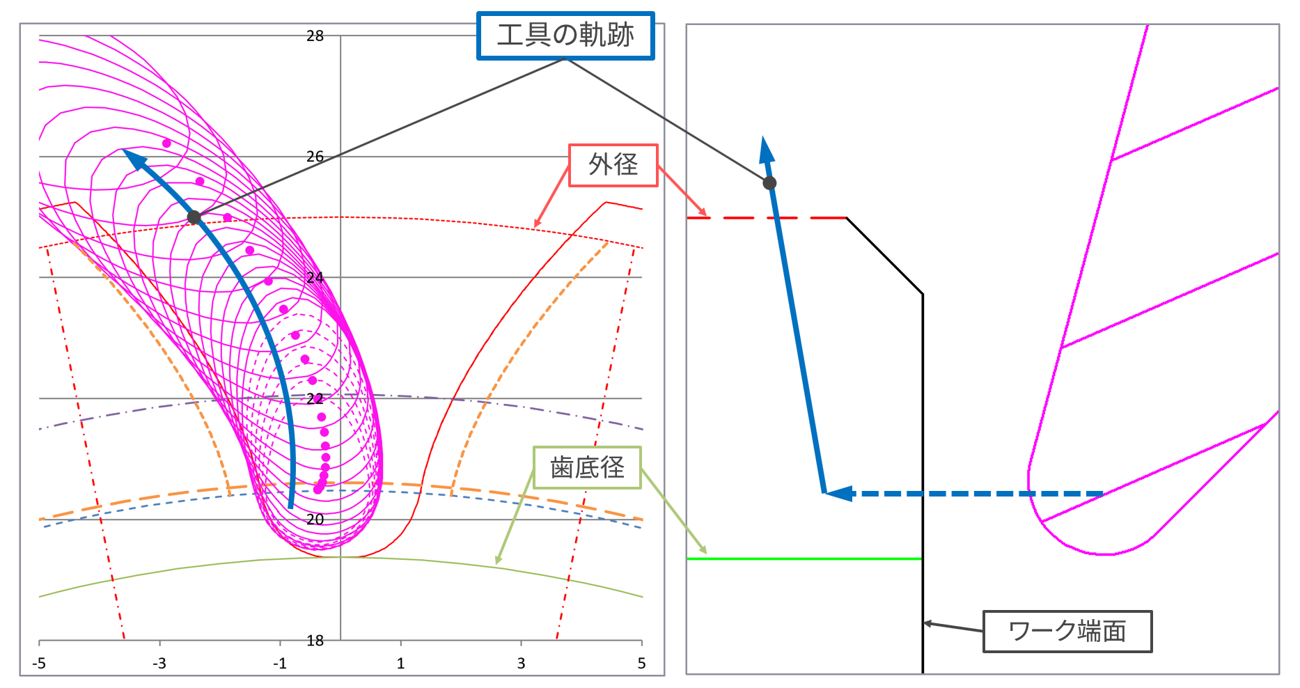 加工の動きとしては、下図の右側の青い点線の矢印のように軸方向に向かって工具中心がワーク端面に入るまでアプローチします。(左の図だとピンク色の点線部がアプローチの工具の軌跡となります。この時に工具の刃先R部で最歯底部が加工されます。