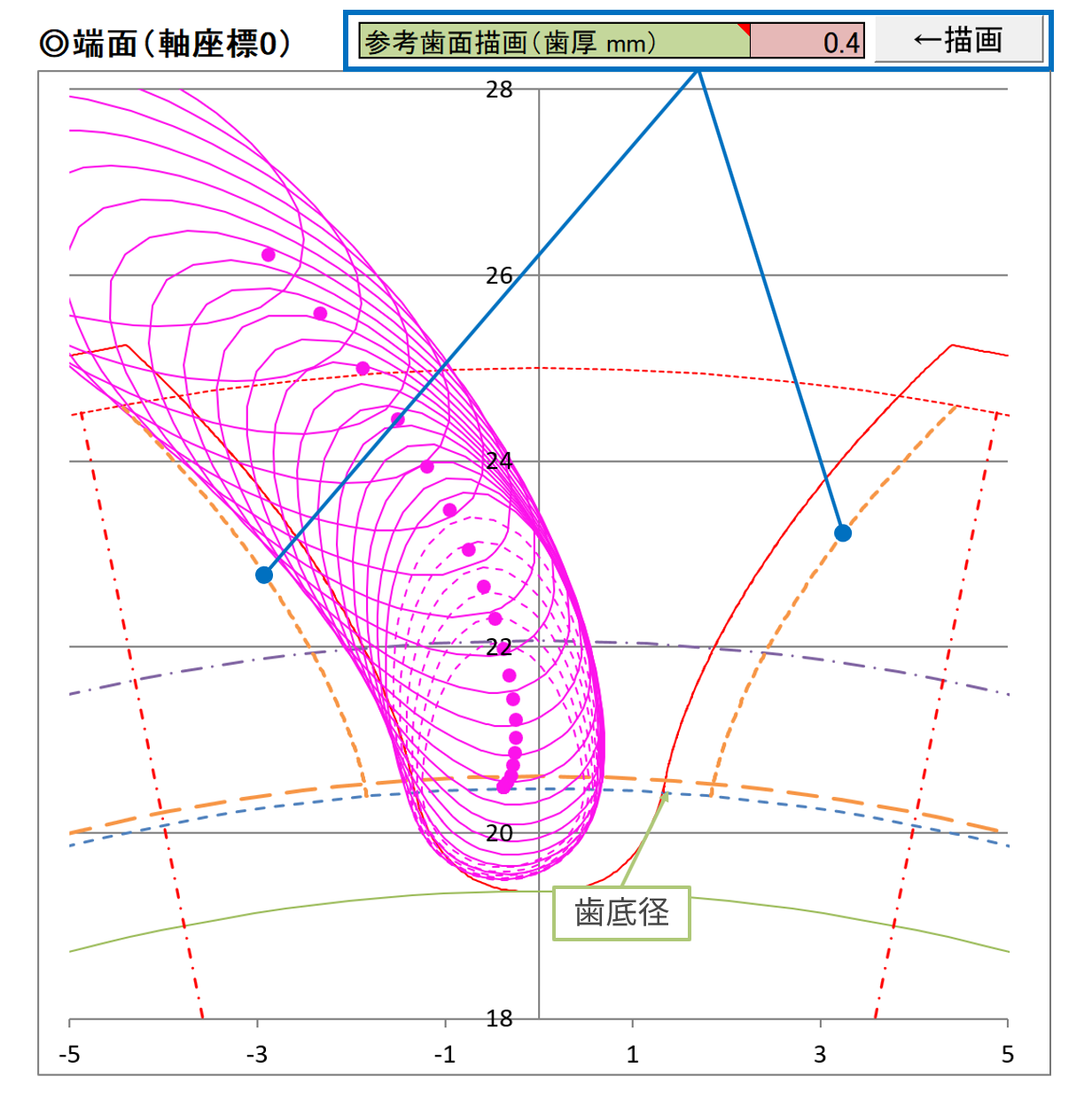 工具の動かし方を入力した結果、径方向の面取り量は、下図のように参考歯面を描画して歯先における円周方向の面取り量を確認します。(下図の場合の歯先の円周方向面取り量は 約"0.4")