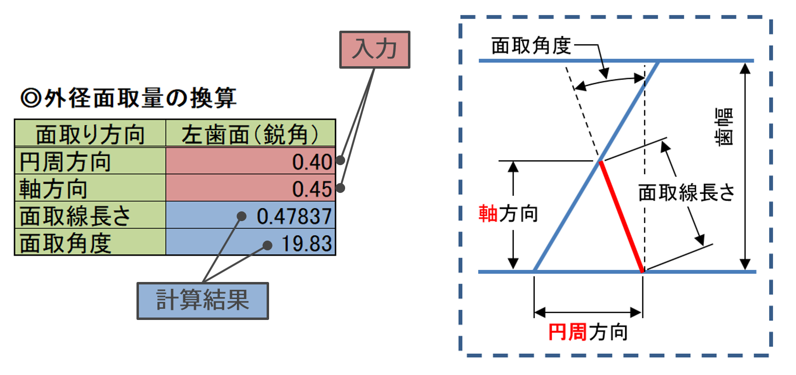円周方向と軸方向の面取り量を確認出来たら、その値を下の表に入力することで、"面取り線の長さ" や "面取り角度が計算結果として得ることが出来ます。