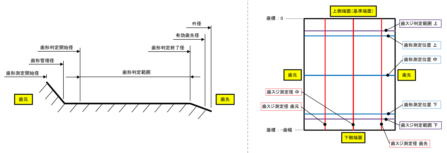 歯形・歯スジ修正を行うには、まず、下図のように歯車精度の判定範囲を設定します。