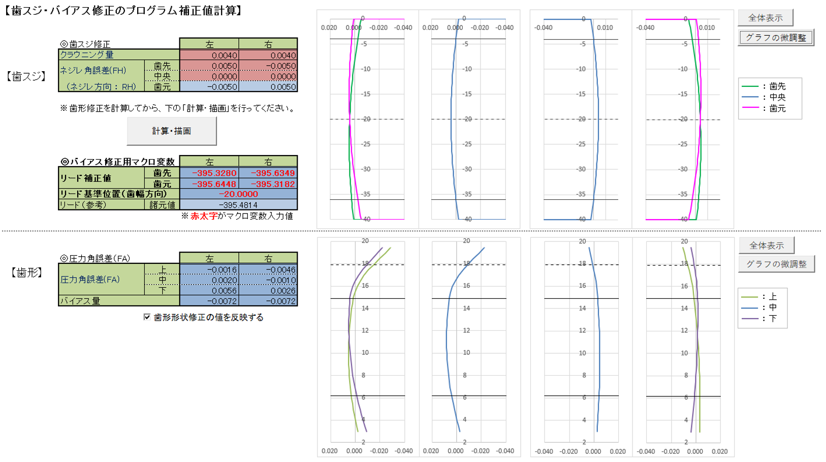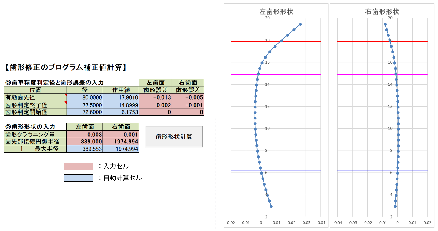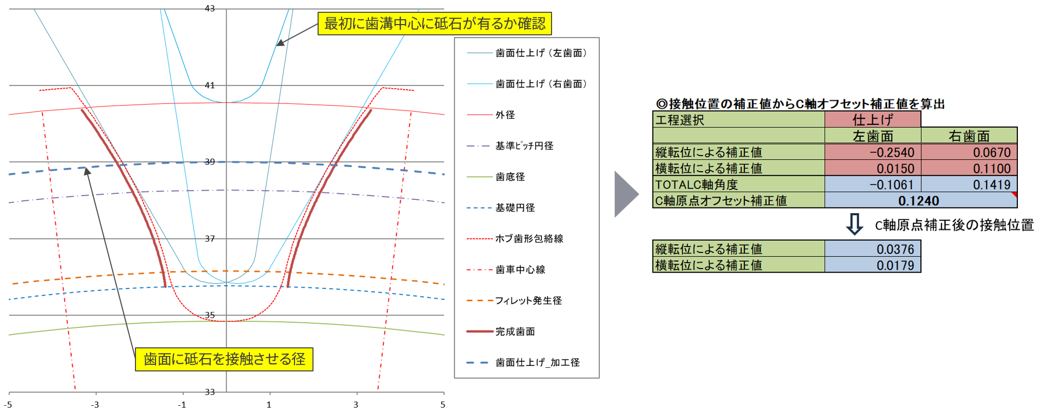少しずつ切り込みを増やす方法としては、縦転位(径方向)と横転位(円周方向)の両方を組み合わせて反対歯面に接触させないように接触確認を進めて行きます。接触した位置は左右のそれぞれに、縦転位と横転位の混じった値が計4つ得られますが、下の図の右の表に4つの値を入力することで、歯の中心の厳密なズレ量を計算する仕組みになっています。