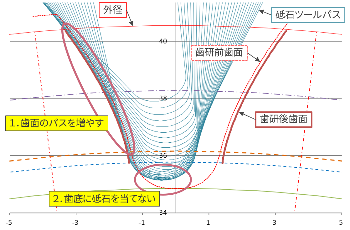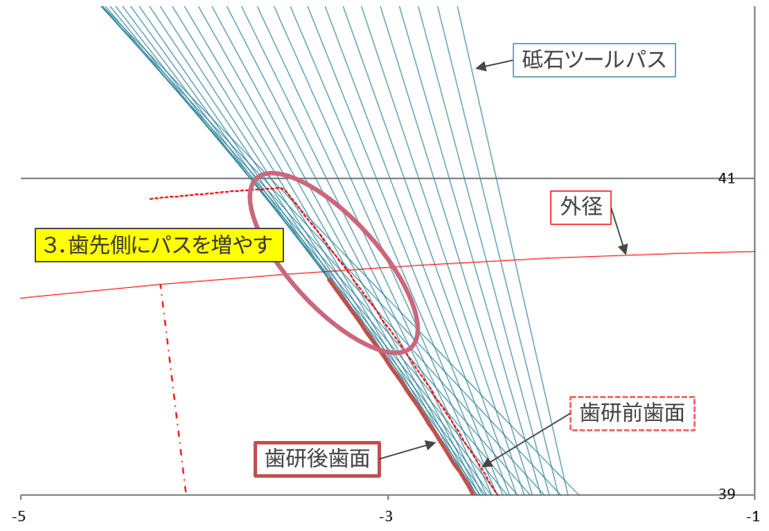 また、一回の切込量で歯面研削を完了させる場合は、加工開始する歯先部で研削負荷が大きくならないよう、下図のように歯先部に余分のパスを追加します。