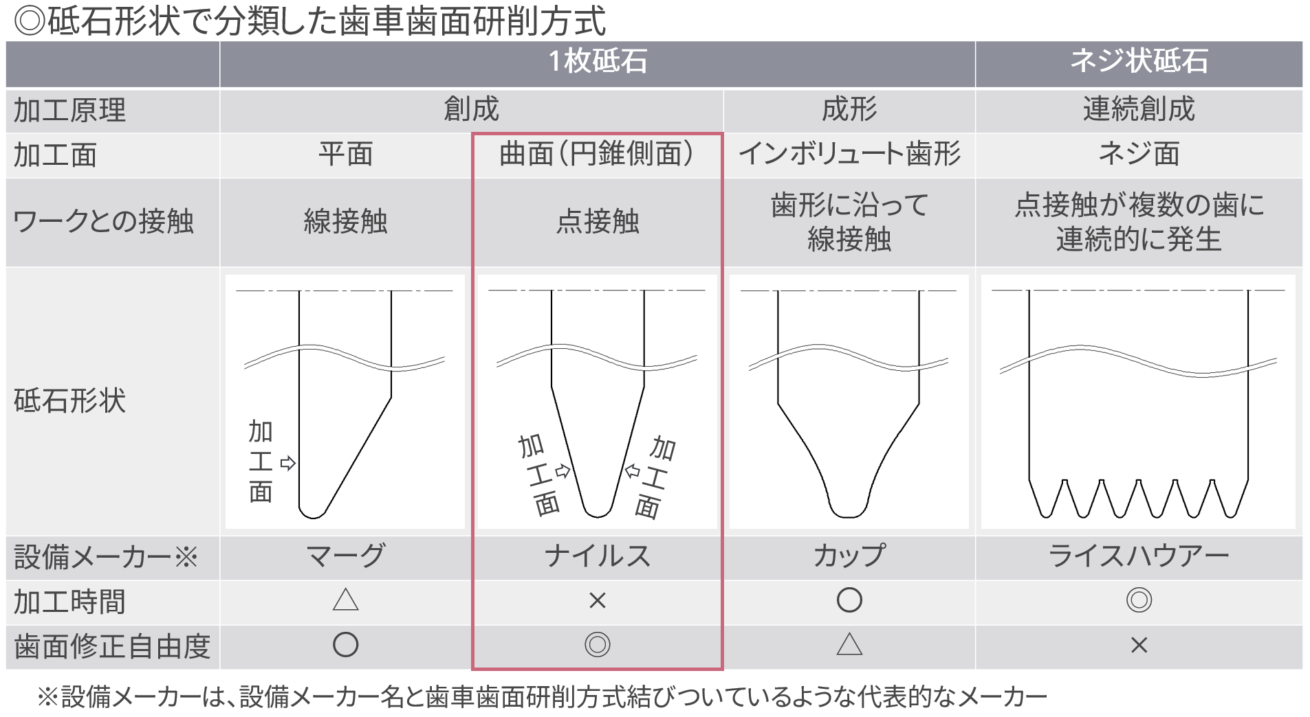 歯車の歯面研削を研削砥石の形状で分類すると下表のようになります。